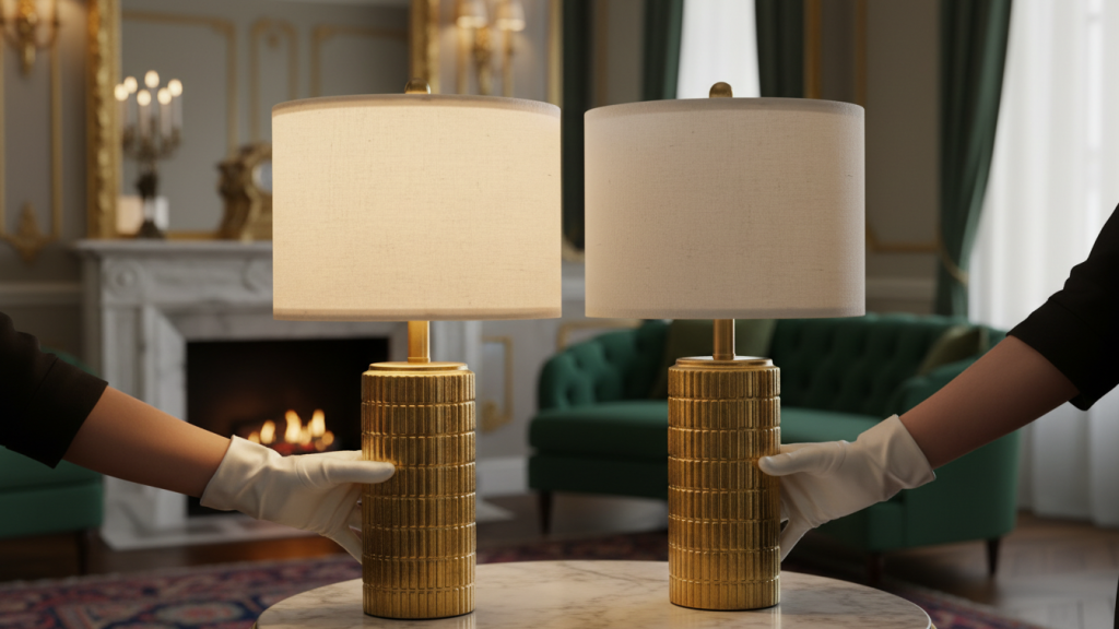 This is a tall, decorative lamp set look—great when you want warm lighting that also feels like a furniture upgrade. The brass/gold vibe naturally complements warm bulbs and warm-toned rooms.