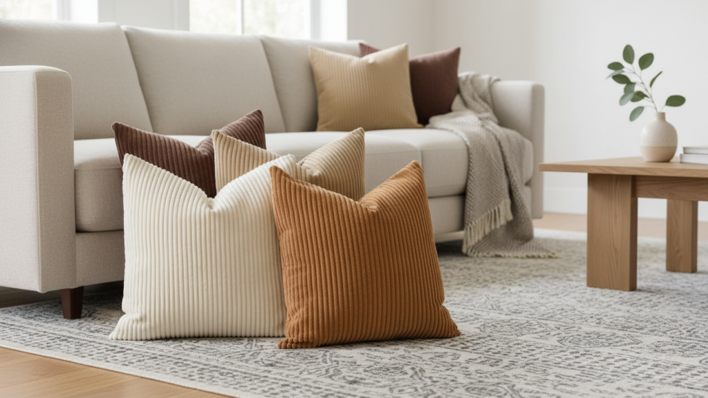 This set leans into a ribbed/corduroy-style texture that looks expensive on a couch, especially in neutral spaces. Because it’s a set of 4 (18×18), it’s an easy way to upgrade a whole sofa without hunting for matching pillows.