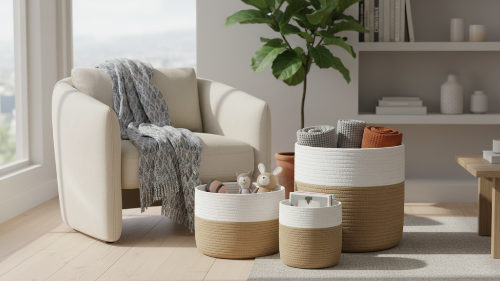 A good living-room basket does two things at once: it hides mess fast and still looks like decor. The best ones are usually cotton rope—soft on floors, sturdy enough to stand up, and easy to move thanks to handles.